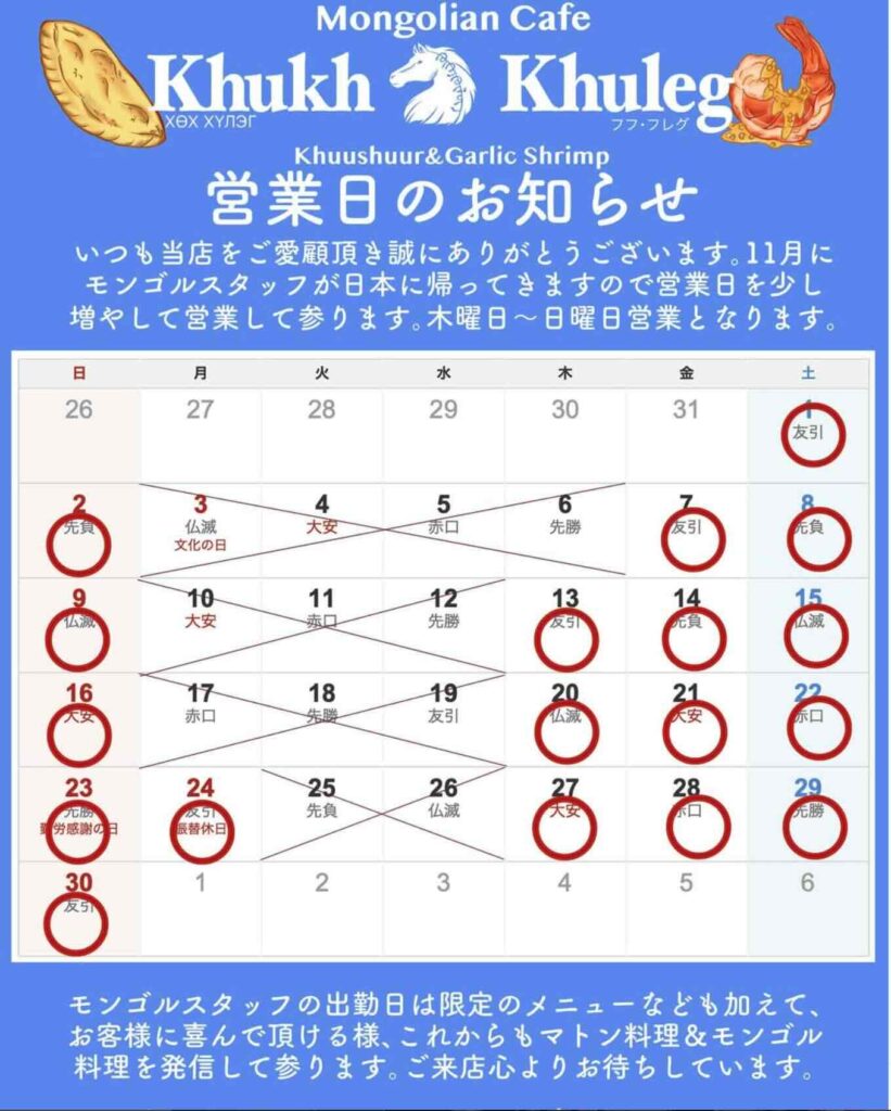 現在臨時営業中で、11月は下記スケジュールとなります。